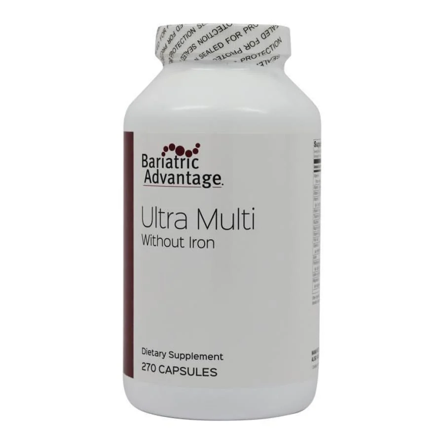 Bariatric Advantage Ultra Multi WITHOUT Iron are Bariatric Advantage's highest potency no-iron multi with each 3-capsule serving delivering at least 200% DV of 12 key nutrients including vitamins A, B1 (thiamin), B12 (cobalamin), D3, and K, along with at least 100% DV of 9 other essential nutrients.